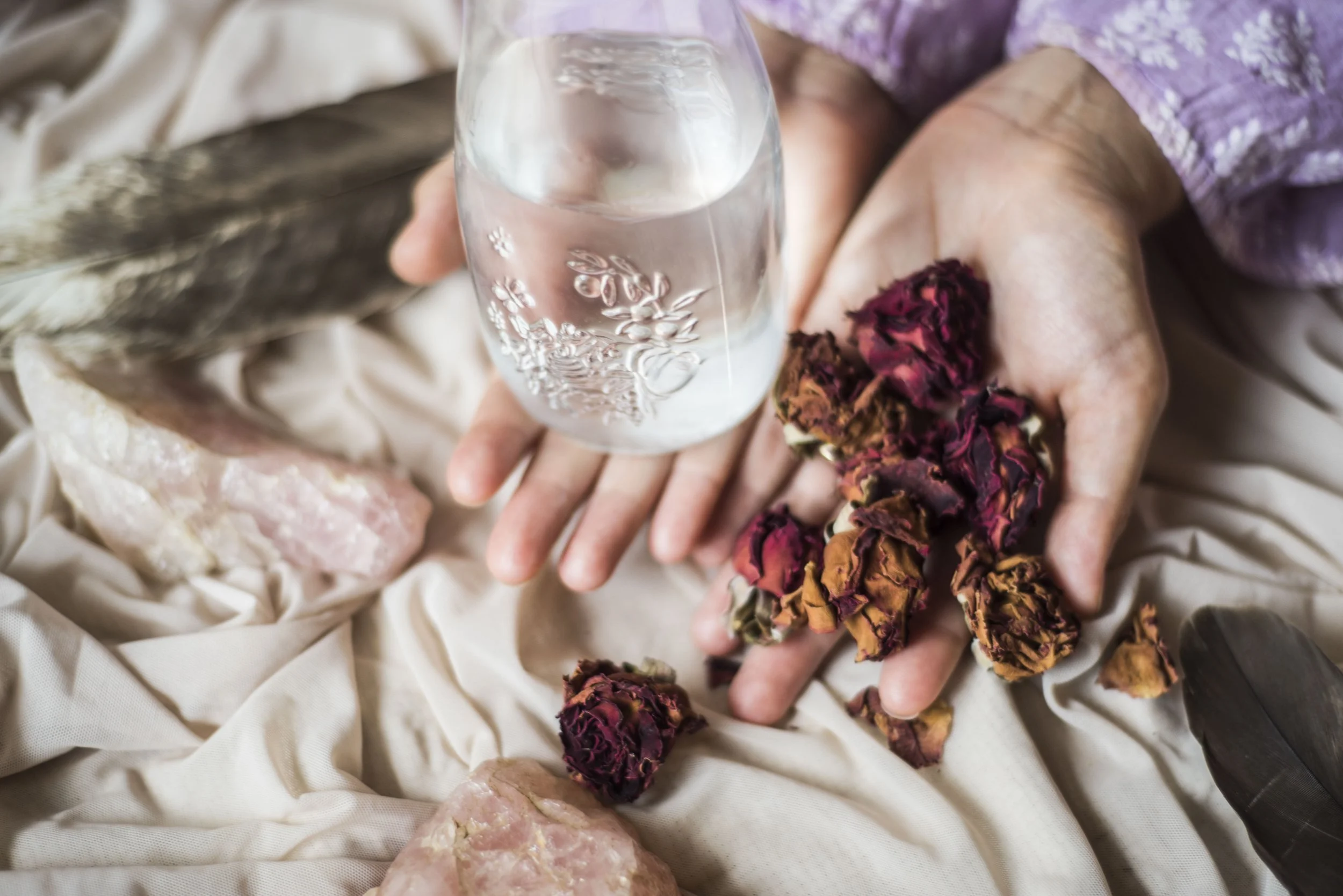 A person holding a glass of water in one hand and dried rose petals in the other hand, surrounded by crystals and stones on a soft fabric surface.